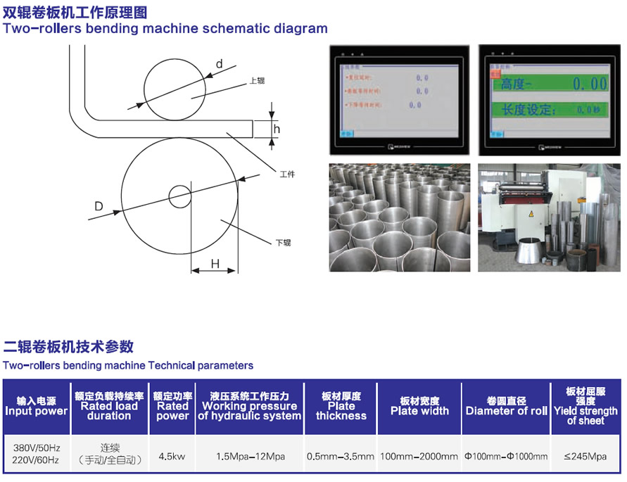 該設備自動化程度高,一次卷制成型,無明顯直邊,卷圓進度高,產品一致性好。提高了生產效率,降低了生產成本。是高效率、高精度、高自動化的卷板設備。廣泛應用于大批量制造薄壁管,汽車油桶、通風管道、煙囪、過濾器,太陽能熱水器,汽車排水管,儲液(氣)罐等等。